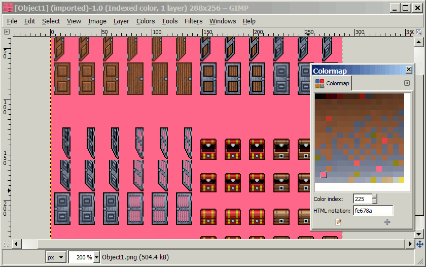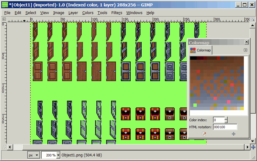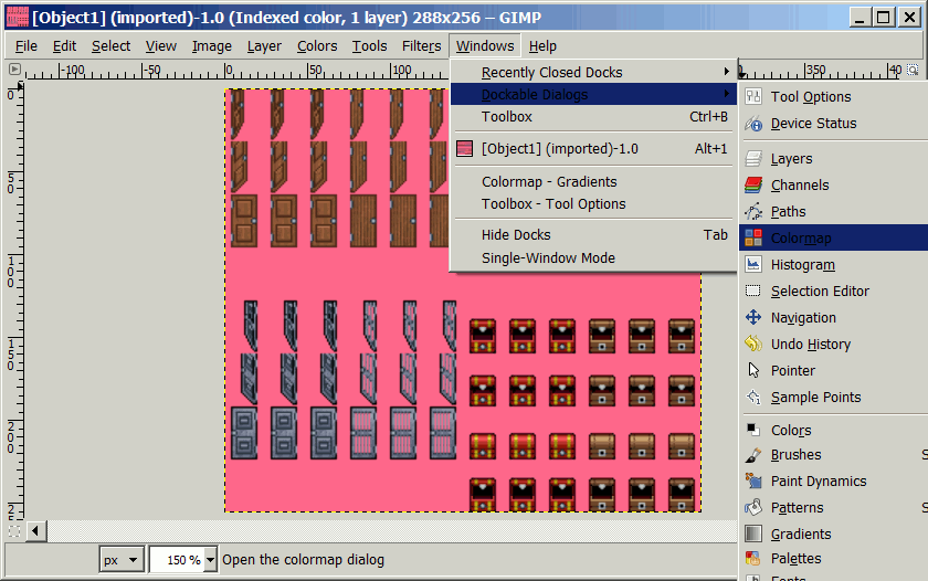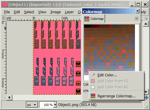 N.B. If the Colourmap window says ‘Only indexed images have a colormap’, make the image indexed with Mode → Image → Indexed. Note that if your image has more than 255 colours, some might be lost during the conversion. If you need more colours, you probably shouldn’t use the RPG Maker 2000/2003 image format: EasyRPG supports other formats, so try these.