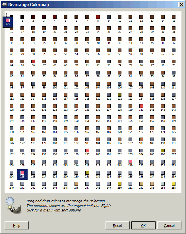 N.B. Make sure there is no selection on your image when you are re-arranging a colourmap. If there is a selection, the colours outside that selection will be swapped.